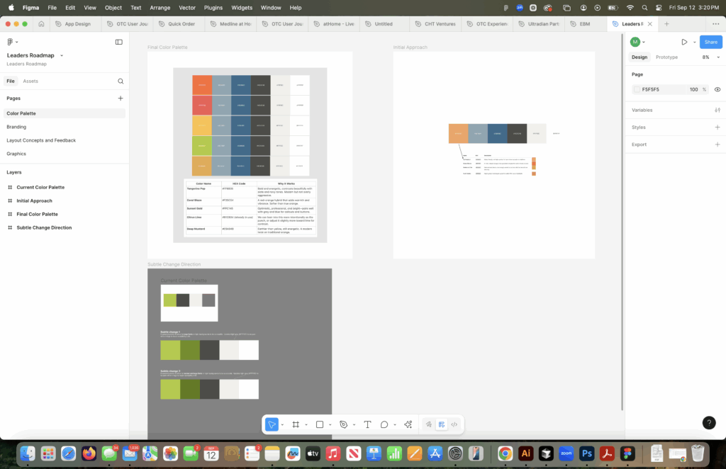 As part of the redesign, we refined the brand color palette to resolve accessibility issues and modernize the overall look. The original greens and grays lacked sufficient contrast, creating readability challenges and limiting flexibility in application. Through iterative testing in Figma, we introduced a refreshed palette anchored by high-contrast tones and complementary accent colors.